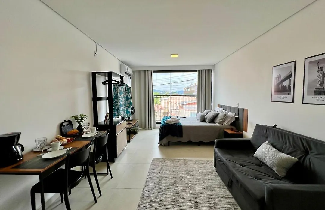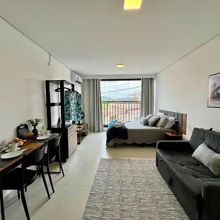 Studio Moderno E Aconchegante - 1Min Do Hospital provides guests with a seating area and a kitchen, as well as such modern comforts as an air conditioner. The apartment features a bathroom with hair dryers and towels. A separate toilet and a shower can also be found.