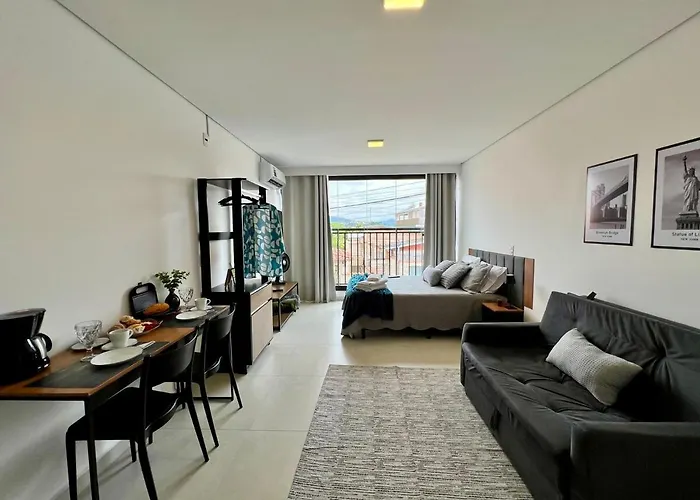 A kitchen with an electric kettle, a fridge, and kitchenware is available as part of Studio Moderno E Aconchegante - 1Min Do Hospital's self-catering amenities. Teleferico cable car station is in the vicinity of the accommodation.